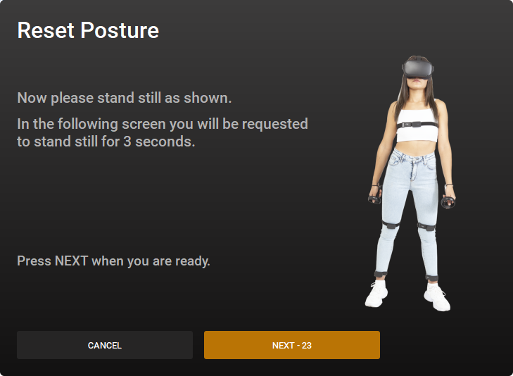 3. Reset Posture: Before going through this step, your OVR nodes must be in the designated locations on your body. In this step, you are asked to put on the headset and stand upright for 3 seconds.